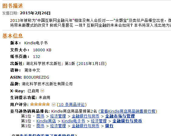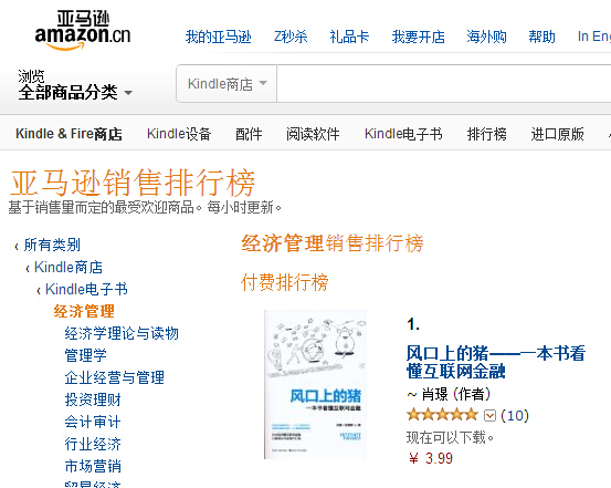近日,我社《风口上的猪:一本书看懂互联网金融》电子书在亚马逊网上销售成绩喜人。参加“每周特价”活动后第二天,销量即位列亚马逊Kindle电子书销售总排行第二、经济管理类销售排行榜第一名。