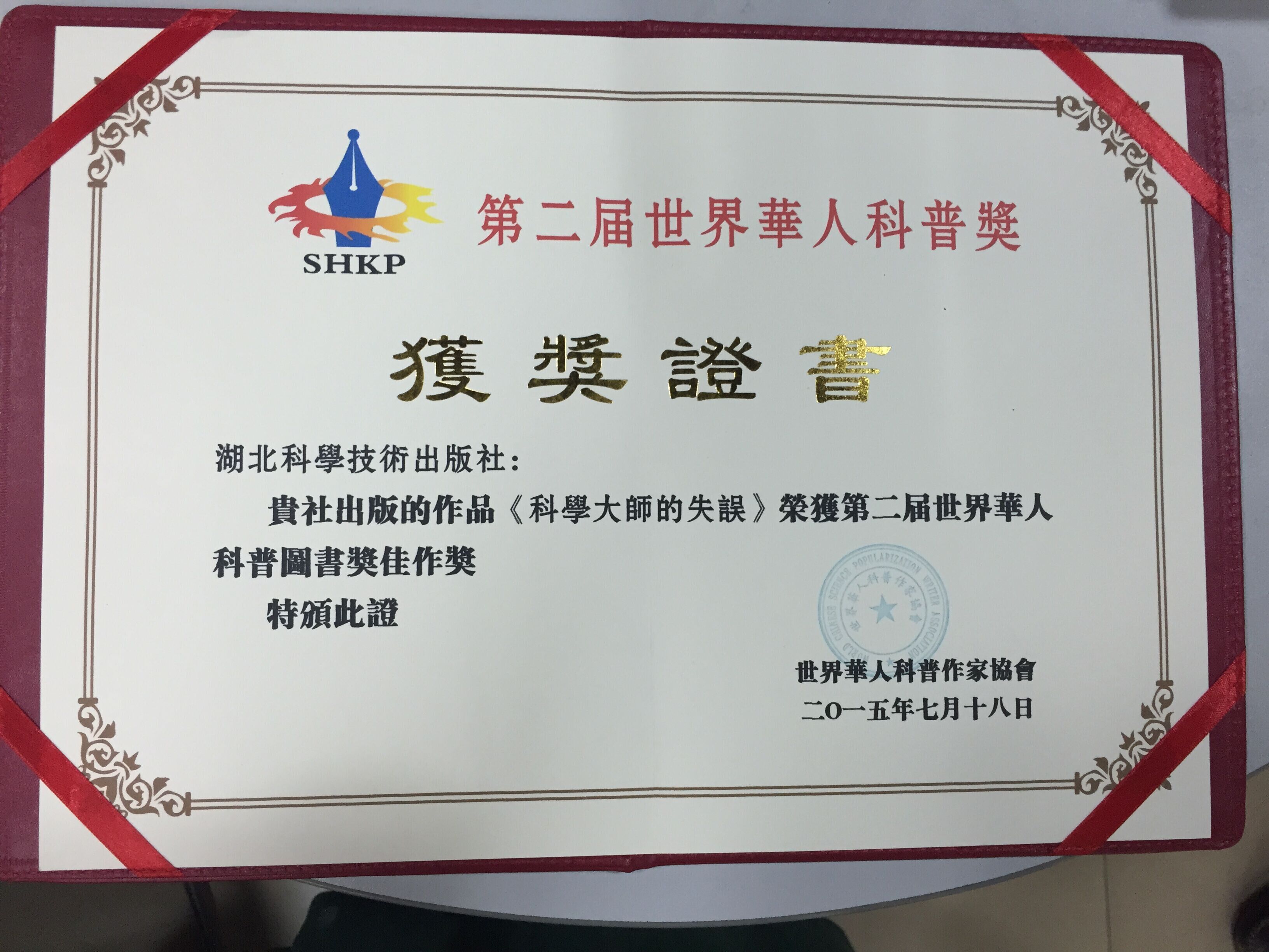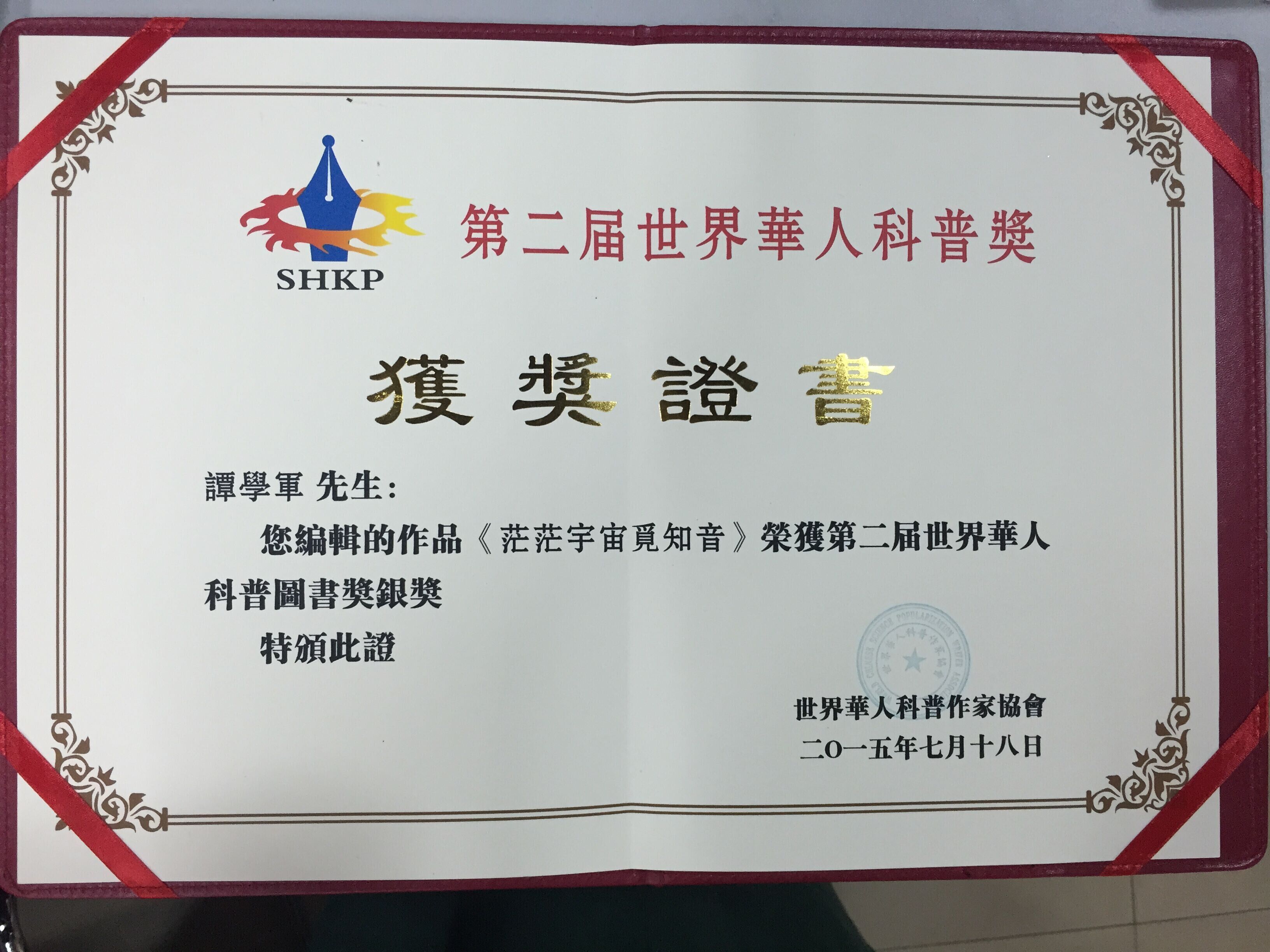 2015年7月18日,由世界华人科普作家协会主办的第二届“世界华人科普奖”颁奖大会在四川成都举行,来自美国、日本等国家和我国台湾、澳门、北京、杭州、武汉、重庆、四川等地区的120余位海内外华人科普作家出席了会议。中国科学院前院长、全国人大常委会前副委员长路甬祥为颁奖会题词表示祝贺。