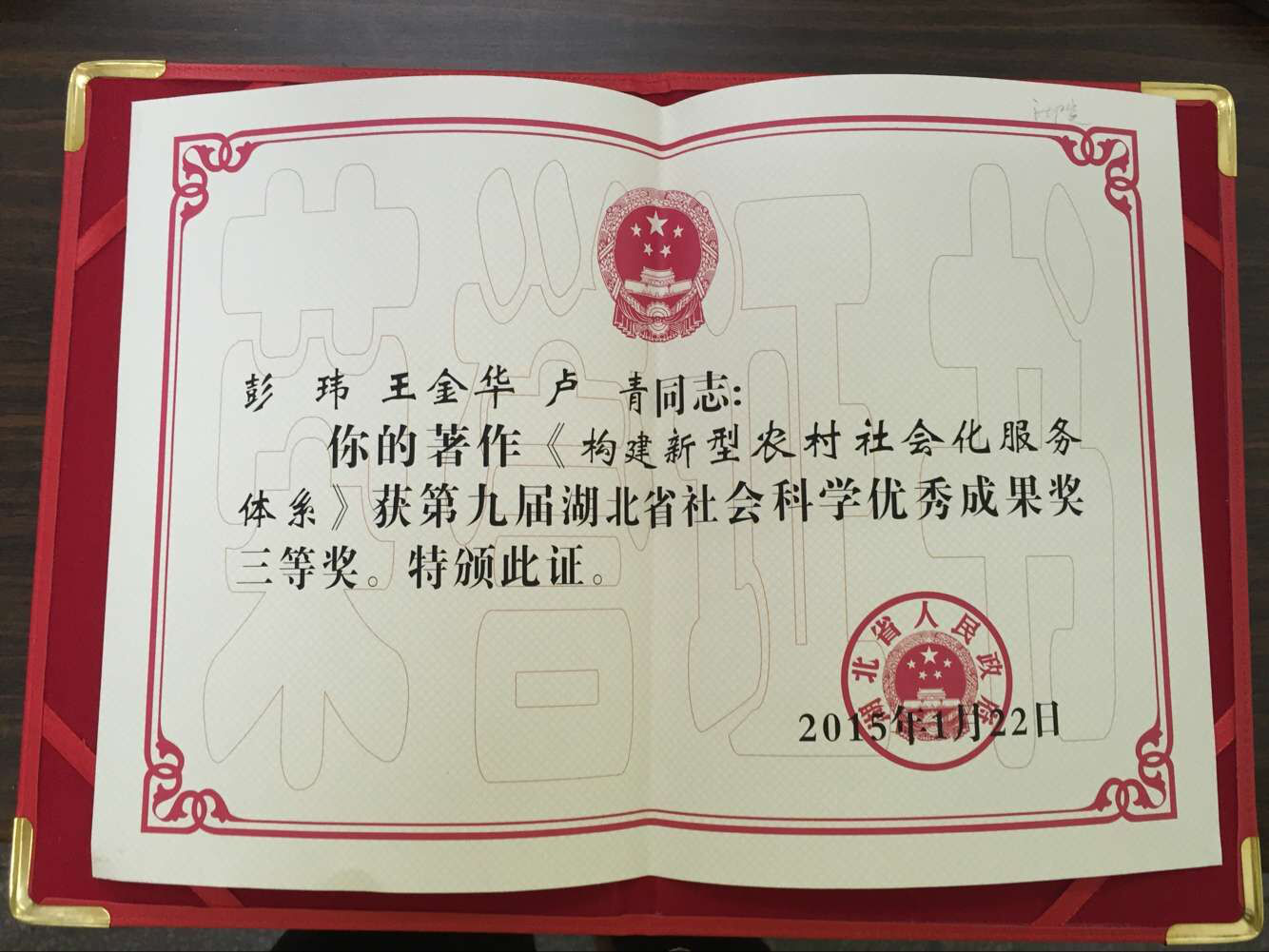 近日,第九届湖北省社会科学优秀成果奖评奖结果揭晓,我社出版的《构建新型农村社会化服务体系》获由湖北省人民政府颁发的三等奖。