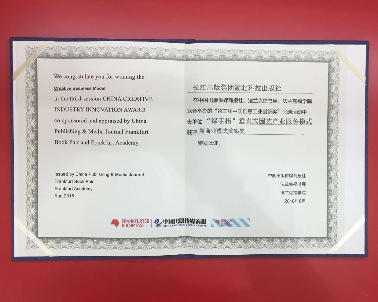 由中国出版传媒商报社、法兰克福书展、法兰克福学院联合主办的“第三届中国创意工业创新奖报告发布暨颁奖礼”,8月25日在北京国际展览中心(新馆)中国出版集团公司展区举行,我社“绿手指”垂直式园艺产业服务模式获评“新商业模式银奖”。