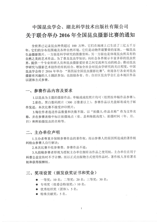 本次2016年“第四届全国昆虫摄影比赛”由中国科学院昆虫学会科普工作委员会和我社联合举办。比赛通知、收集作品和获奖作品评审、展板制作、获奖作品展览等将由两家单位合作完成,颁奖后展板由我社收藏,本次摄影比赛的优秀作品将集结出版。