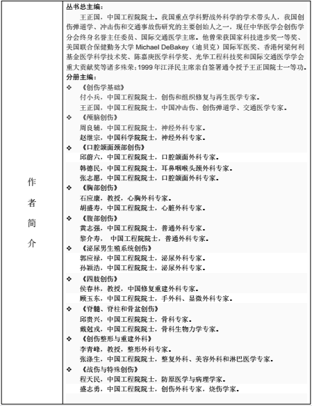 丛书总主编由王正国院士担任,王正国院士是我国重点学科野战外科学的学术带头人,我国创伤弹道学、冲击伤和交通事故伤研究的主要创始人之一,现任中华医学会创伤学分会终身名誉主任委员、国际交通医学主席。他曾荣获国家科技进步奖一等奖、美国联合保健勤务大学Michael DeBakey(迪贝克)国际军医奖、香港何梁何利基金医学科学技术奖、陈嘉庚医学科学奖、光华工程科技奖和国际交通医学学会重大贡献奖等诸多殊荣;1999年江泽民主席亲自签署通令授予王正国院士一等功。