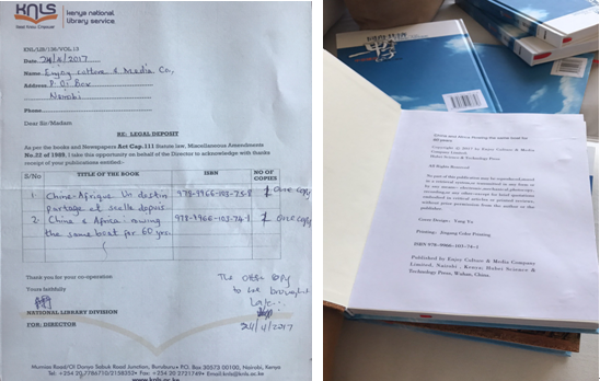 肯尼亚国家图书馆于4月24日正式收录及馆藏此套图书,以后在肯尼亚及其他英联邦国家均可通过图书馆数据库系统查询到该书的出版信息。ISBN: 978-9966-103-74-1
