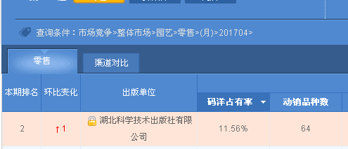 根据北京开卷市场研究所最新发布的资料显示,2017年4月,我社“绿手指”园艺图书的动销品种数为64个,市场码洋占有率为11.56%,荣登全国园艺图书零售市场开卷排名第二位。