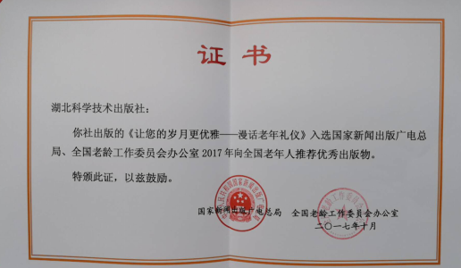 国家新闻出版广电总局办公厅和全国老龄工作委员会办公室综合部于2017年7月启动了2017年向全国老年人推荐优秀出版物活动,并于10月26日召开推荐活动新闻发布会,评选出45种图书和10种电子音像类出版物。我社《让您的岁月更优雅——漫话老年礼仪》作为生活休闲类图书入选。