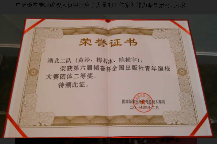 2017年12月2日,由国家新闻出版广电总局主办,中国出版协会、韬奋基金会、中国编辑学会承办的第六届韬奋杯全国出版社青年编校大赛在京落幕,我社参赛的青年员工陈横宇所在的湖北二队荣获团体二等奖。
