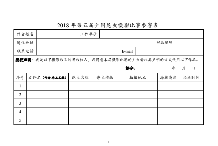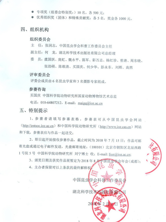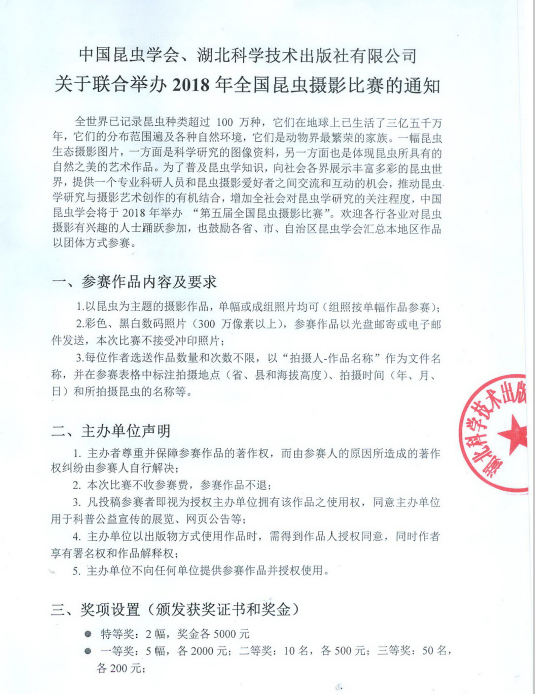 本着强烈的社会责任感,为了倡导绿色发展理念,普及昆虫学知识,向社会各界展示丰富多彩的昆虫世界,提供一个专业科研人员和昆虫摄影爱好者之间交流和互动的机会,推动昆虫学研究与摄影艺术创作的有机结合,增加全社会对昆虫学研究的关注程度,激发社会各界建设人与自然和谐共处的美好家园,湖北科学技术出版社有限公司将和中国昆虫学会联合举办2018年第五届全国昆虫摄影比赛,从即日起到2018年7月15日,广大昆虫摄影爱好者均可参赛。