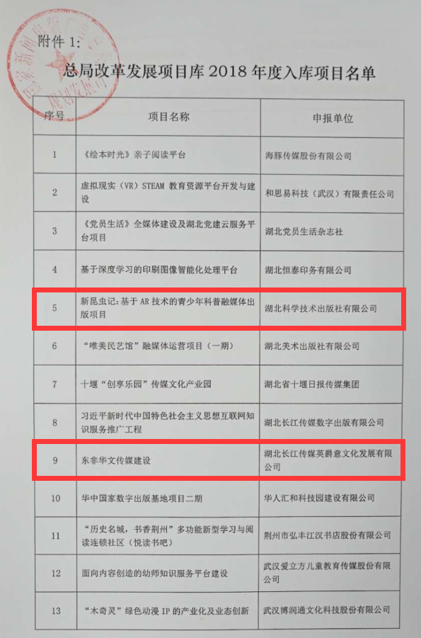 近日,国家新闻出版广电总局下发了《关于总局改革发展项目库2018年度入库项目的通知》,经总局专家评审组审核并报经总局领导批准,湖北省此次共有15个项目入选。我社申报的“新昆虫记:基于AR技术的青少年科普融媒体出版项目”和湖北长江传媒英爵意文化发展有限公司申报的“东非华文传媒建设项目”均获批入库。