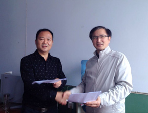 湖北科技出版社襄阳分社执行社长秋子(左)与襄阳日报谷城记者站站长姜道明签署《关于成立湖北科学技术出版社襄阳分社谷城编辑部的合作协议》。(记者张莹 摄)
