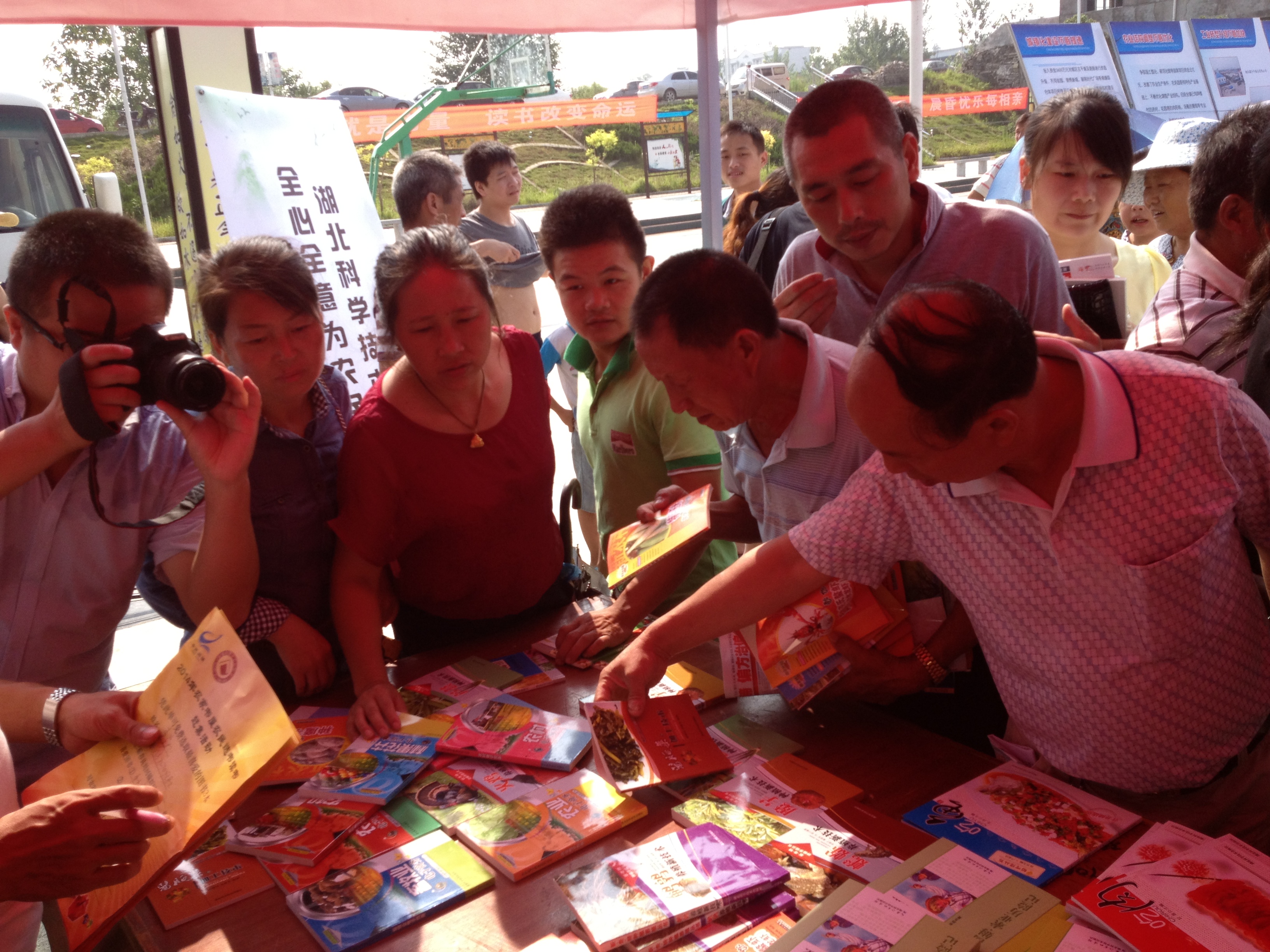 2014年8月湖北省农家书屋农民读书选书赶集会活动,分别在湖北随州、蕲春、洪湖举行。本次活动由省新闻出版广电局、省全民阅读活动领导小组办公室、省科学技术协会主办。湖北科技社做为主要参展单位参加了系列活动,活动中我社提供价值5万元的各类出版物供当地农民群众自由选择,包括农业科技、生活保健、少儿等各类图书2000余册。活动深受农民欢迎,现场火爆,我社图书被农民朋友抢选一空,省新闻出版广电局党组成员、副局长鄢桃生来到我社图书的展台,他指出,今年是全省农家书屋图书的出版、管理、使用工作提档升级的重要一年,也是我省农家书屋全面补充更新出版物的重要一年。出版好农村图书是当前各项工作的关键,更是确保农家书屋发挥作用的关键。
