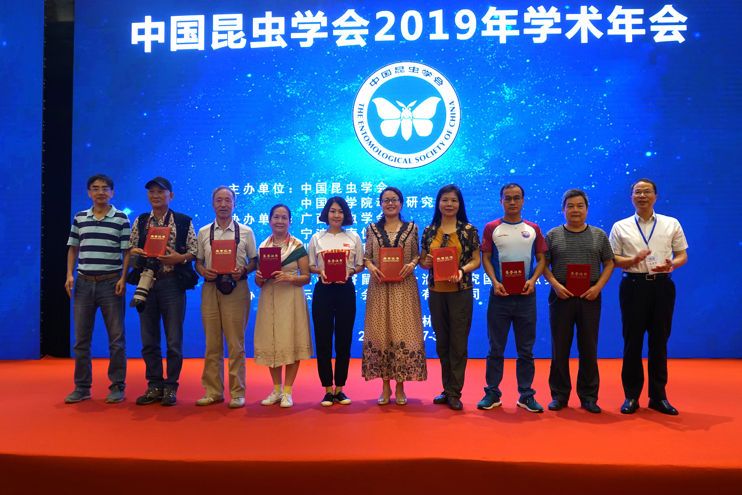 开幕式上,中国昆虫学会科普工作委员会主任、中国科学院动物研究所研究员张润志宣读了2019年全国昆虫摄影比赛获奖名单,并主持颁奖仪式。优秀组织奖获得者广东省昆虫学会昆虫摄影协会的8位摄影爱好者代表全体获奖者上台领奖。