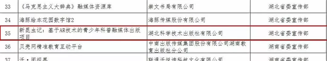 近日,国家新闻出版署公布了数字出版精品遴选推荐计划2019年度入围项目,我社“新昆虫记:基于AR技术的青少年科普融媒体出版项目”成功入围,是湖北省入围的3个项目之一。本次评审,全国各地各部门共选送了517个项目,最终只确定95个入围项目,这些入围项目导向正确、内容优质、创新突出、双效俱佳,代表了现阶段出版融合发展的综合水平。
